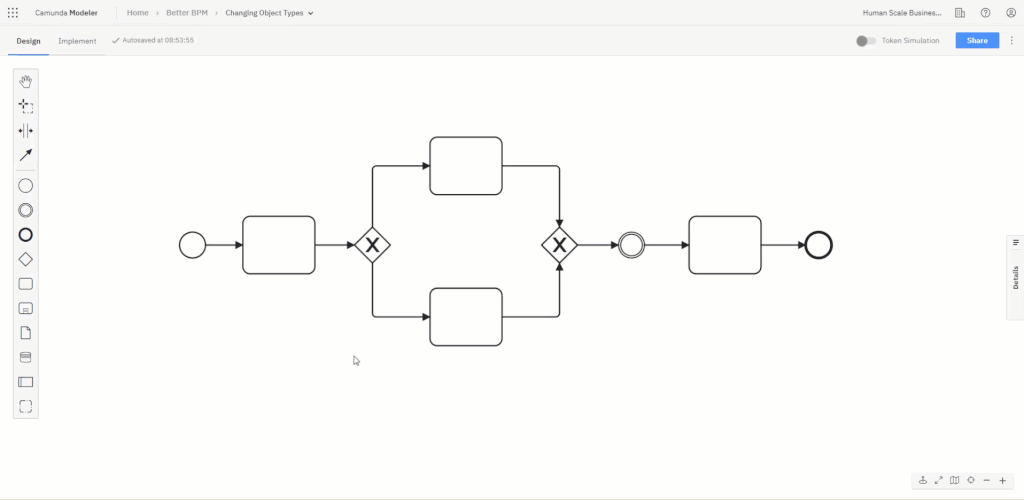 When you add activities, gateways, and intermediate events to your Camunda model, they will default to the most common types: tasks, exclusive (XOR) gateways, and none-type intermediate events.
