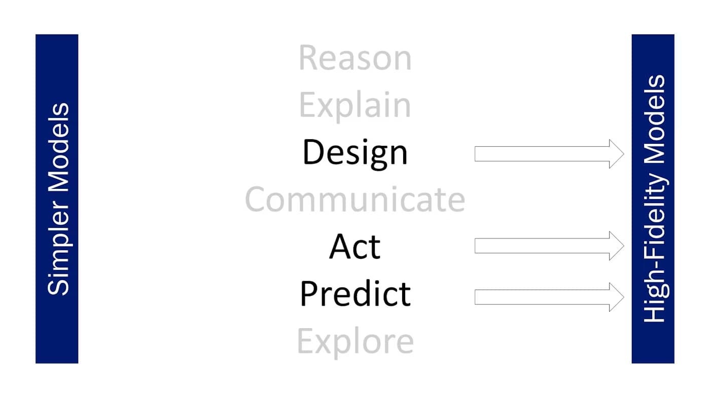Reasoning, explaining, communicating, and exploring tend to benefit from simpler, more tractable models at the expense of fidelity: